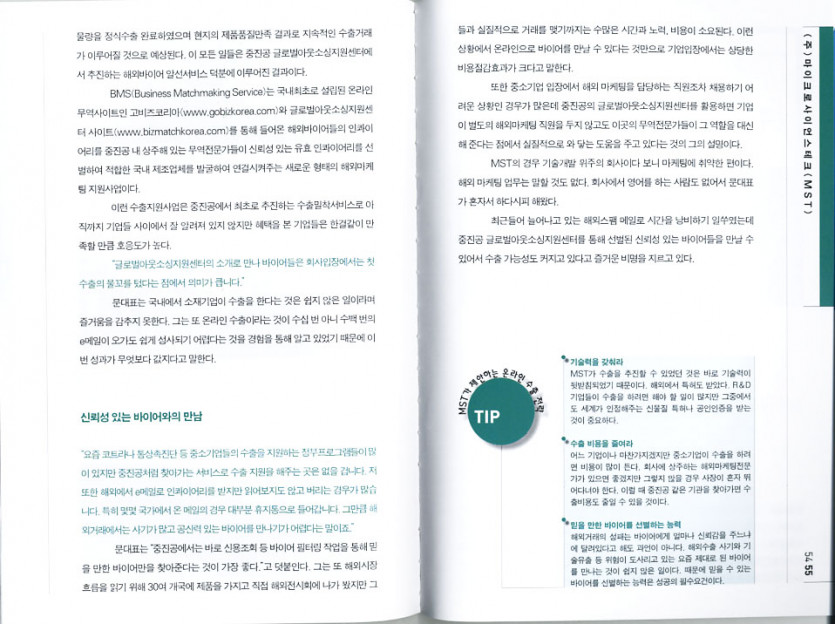 국내 업체를 물색하던 중 MST가 이 분야에 독보적인 기술력을 갖추고 있다는 것을 알게 되었고 MST에 말레이시아 바이어에 대한 정보를 제공해 주었다. 중진공이 소개해 준 말레이시아 바이어와 향후 3년간 2,100만 달러 규모의 MOU를 체결하는 데 성공한 것이다. 더구나 이번의 MST와 MOU를 체겨한 말레이시아 텍스캠사는 우리나라의 SK케미컬과ㅑ 같은 수준의 대기업으로 향후 본격적인 수출이 성사될 경우 파급효과가 클 것으로 기대되는 회사이다.
